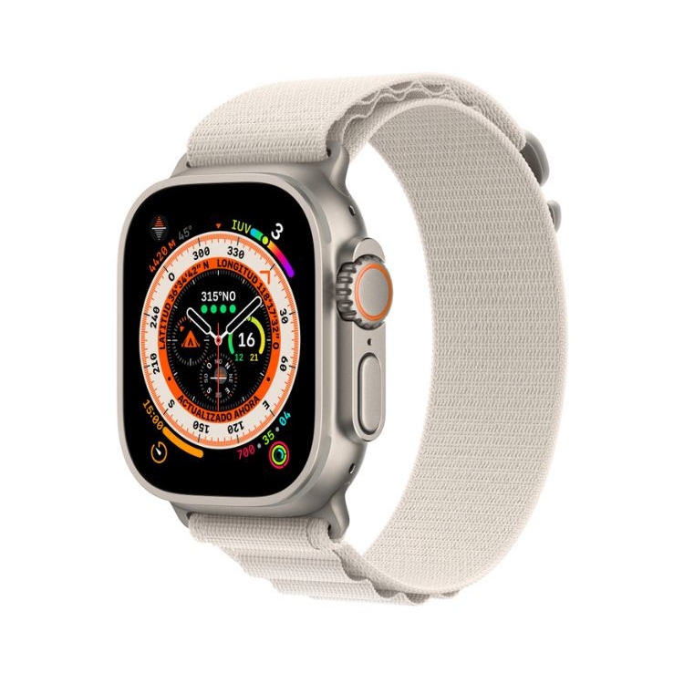 Un reloj que desafía los límites. Descubre el Apple Watch más duro y potente que existe. Con una caja de titanio capaz de aguantarlo todo, GPS de doble frecuencia y alta precisión, hasta 36 horas de autonomía, conexión móvil para mayor libertad y tres correas especialmente creadas para deportistas y amantes de la aventura. Prepárate, vienen tiempos salvajes.. . Tiene la piel dura.. Hemos cuidado hasta el último detalle para crear un reloj deportivo épico, con un rendimiento que no tiene rival. El titanio ofrece el equilibrio perfecto entre peso, dureza y resistencia a la corrosión. La nueva caja tiene bordes elevados para proteger el cristal plano de zafiro de impactos laterales. Y tanto la Digital Crown como el botón lateral son ahora más grandes para que puedas usarlos también con guantes.. Caja de titanio de 49 mm. Resistencia al agua de 100 m*. Sometido a las pruebas MILSTD 810H. Resistencia al polvo IP6X. . Esfera Wayfinder con modo Noche. La esfera Wayfinder, diseñada específicamente para el Apple Watch Ultra, tiene espacio para ocho complicaciones y un dial de hora que puedes cambiar por una brújula. ¿Te has quedado sin luz? Gira la Digital Crown para activar el modo Noche y ver los datos en rojo brillante. Y que no pare la aventura.. Acción y al lío. El nuevo botón Acción te permite acceder al instante a multitud de funciones. Puedes personalizarlo para controlar un entreno, marcar un punto de referencia en la brújula o iniciar una inmersión. Púlsalo y desata todo su potencial. Y el tuyo.. Como una navaja suiza. El Apple Watch Ultra es una herramienta potente y versátil que concentra un montón de prestaciones en un espacio a la medida de tu muñeca. Míralo bien, está equipado hasta los dientes.. . Días de autonomía. Cuando llevas dos jornadas con la mochila a cuestas, afrontas la etapa final de un triatlón o buceas alrededor de un arrecife de coral, lo último que quieres es quedarte sin batería. Pero no te preocupes porque ahora vas a tener más autonomía que nunca para embarcarte en cualquier . aventura. Y soñar con la siguiente. . Camina, corre, bucea. Hay una correa para eso. Diseñar un reloj legendario para todo tipo de atletas suponía centrarnos en sus exigencias concretas. Por eso lo hemos dado todo para crear tres correas especiales, concebidas específicamente para las aventuras al aire libre, los entrenos de resistencia y los deportes acuáticos.. . Los números corren a tu favor . Disponer de estadísticas y datos precisos es clave para progresar en cualquier deporte. La app Entreno se ha actualizado con nuevos indicadores y vistas que te ofrecen toda la información necesaria para batir tu mejor marca. Y como la pantalla es tan amplia, puedes ver hasta seis métricas a la vez.. . Zonas de Frecuencia Cardiaca. Comprueba tu nivel de intensidad de un vistazo. Las zonas de entrenamiento se calculan y personalizan automáticamente a partir de tus datos de salud, aunque también puedes crearlas manualmente.. . Técnica de carrera. Añade a las vistas datos como la longitud de zancada, el tiempo de contacto con el suelo y la oscilación vertical para mejorar tu técnica.. . Potencia en Carrera. Esta prestación mide al instante el esfuerzo y te ayuda a mantener el nivel sin agotarte.. . Botón Acción. Corre con puntualidad. Si quieres medir tus progresos con precisión, configura el botón Acción para controlar un entreno, marcar un segmento o pasar al siguiente intervalo.. Un GPS que abre caminos.. La fiabilidad del GPS es fundamental para registrar métricas precisas en los entrenamientos, ya sea en ciudad o en plena naturaleza. El Apple Watch Ultra incluye un nuevo sistema de GPS de doble frecuencia y alta precisión tan puntero que da en la diana incluso en entornos difíciles.. Llega hasta el filo. Y regresa.. El Apple Watch Ultra aguanta altitudes, temperaturas y entornos extremos. Es un instrumento de exploración esencial pensado para llevarte hasta el último confín del mundo y traerte a casa de una pieza.. La brújula toma una nueva dirección.. Para adentrarse en territorio desconocido, resulta vital contar con una brújula fiable. Gracias a las nuevas vistas y funciones de la app Brújula, solo tendrás que mirar tu muñeca para orientarte y no perder nunca más el Norte.. Sirena de 86 decibelios. Pide ayuda a la velocidad del sonido. Si te pierdes o lesionas y necesitas ayuda, mantén pulsado el botón Acción para activar una sirena que se oye en un radio de 180 metros.. Hasta 60 h. en modo de bajo consumo para varios días de aventuras. De -20 a 55 ºC. Temperatura de funcionamiento en la muñeca, para el frío intenso de las cumbres y el calor abrasador de los desiertos.. Certificación EN13319. Un estándar para accesorios de buceo reconocido internacionalmente. Todo un ordenador de buceo.. Diseñada en colaboración con Huish Outdoors, una empresa puntera de equipamiento submarino, la app Oceanic+ para el Apple Watch Ultra es un auténtico ordenador de buceo para la muñeca. Está hecha para practicar buceo y apnea recreativos a profundidades de hasta 40 metros con todas las funciones necesarias. Pruébala, es la mar de fácil.. Innovaciones más profundas. Gracias al nuevo profundímetro, la app Profundidad es perfecta para practicar esnórquel o cualquier otra actividad subacuática que no requiera preparación previa. La app te muestra el tiempo, la profundidad actual, la temperatura del agua, la duración de la inmersión y la profundidad máxima alcanzada. Hasta puede activarse automáticamente cuando te sumerges.. Botón Acción. Preparado, listo, bucea. Si programas el botón Acción para abrir la app Profundidad o configurar un rumbo durante una inmersión con Oceanic+, te resultará mucho más fácil controlar el reloj mientras estás bajo el agua.. Listo para tus aventuras del día a día.. El reloj que desafía todos los límites también tiene prestaciones que te ayudan a llevar una vida sana, segura y con