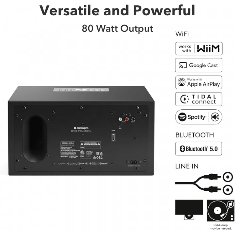 Audio Pro C10 MKII W BLACK. Un campeón indiscutible del sonido HiFi multiroom. Compacto y fácil de colocar, este altavoz ofrece una potencia impresionante. El C10 MkII W permite escuchar música en varias habitaciones mediante nuestra nueva aplicación Audio Pro, además de ser compatible con Google Cast, AirPlay 2, Spotify Connect y Tidal Connect, y ofrece un sonido aún mejor que su predecesor, el C10 MkII. Altavoz multiroom con una nueva aplicación fácil de usar. 6 preajustes. Parte frontal de tela desmontable.