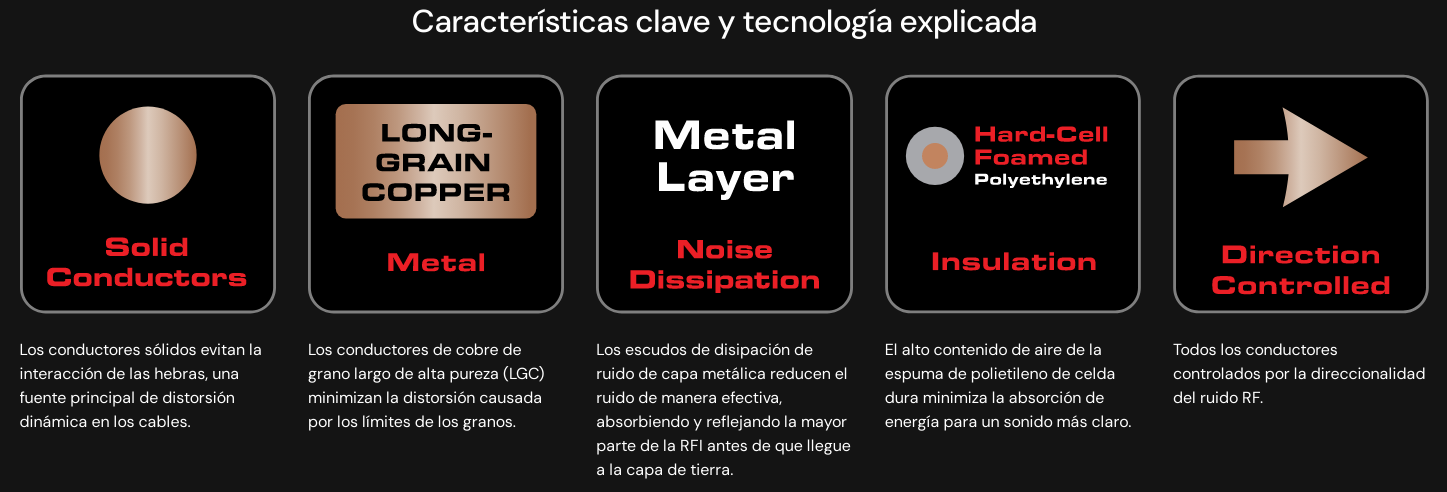 El Cobre de Grano Largo Sólido (LGC) permite un sonido más suave y claro que los cables que utilizan cobre OFHC (Conductividad Alta Libre de Oxígeno) regular. Los conductores sólidos evitan la interacción de las hebras, una fuente principal de distorsión. La calidad de la superficie es crítica porque un conductor puede considerarse como una guía de riel tanto para los campos eléctricos dentro de un conductor, como para los campos magnéticos fuera del conductor. LGC tiene menos óxidos dentro del material conductor, menos impurezas, menos límites de grano y definitivamente un mejor rendimiento.
