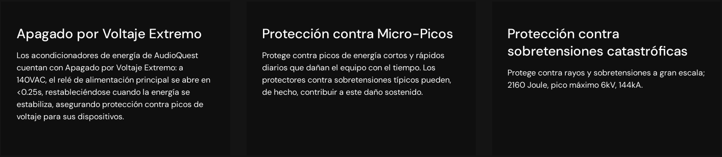AudioQuest PowerQuest 3. 8-Outlet Power Conditioner & Non-Sacrificial Surge Protector. Los protectores contra sobretensiones y filtros de energía PowerQuest superan a otros productos de energía en su clase, reduciendo efectivamente el ruido y la distorsión mientras soportan sin problemas una amplia gama de sistemas de audio y video. El PowerQuest 3 va un paso más allá, sirviendo como un versátil centro de energía central para tus dispositivos electrónicos. Con ocho tomas de corriente, acomoda una variedad de componentes A/V, mientras que las conexiones de red y teléfono proporcionan una fácil integración para módems, enrutadores y sistemas telefónicos. Los puertos de entrada/salida de cable coaxial aseguran la compatibilidad con cajas de cable, y las tomas de corriente de tres clavijas hacen del PowerQuest 3 la elección perfecta para alimentar tu completo sistema de entretenimiento en casa.