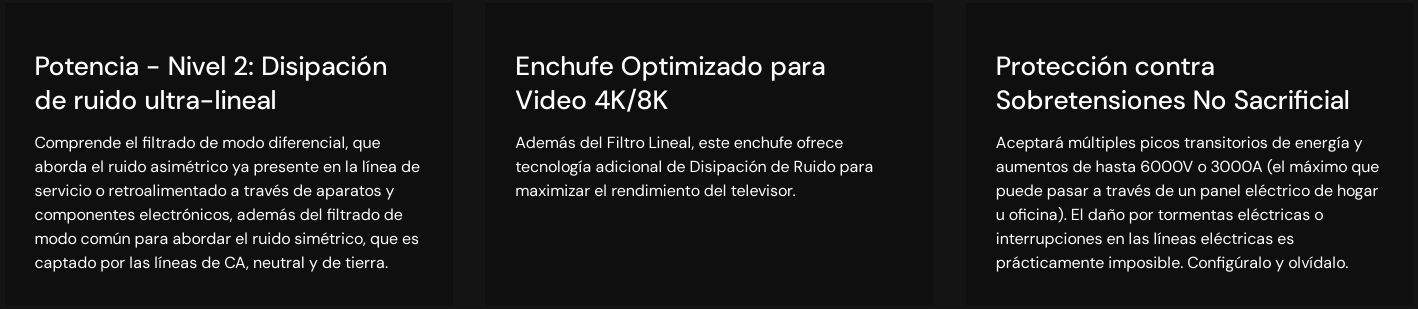 - 2 Enchufes Optimizados para Video 4K/8K: Perfectos para televisores, proyectores o reproductores universales, este enchufe cuenta con un filtro lineal y tecnología adicional de disipación de ruido para maximizar el rendimiento de la pantalla.