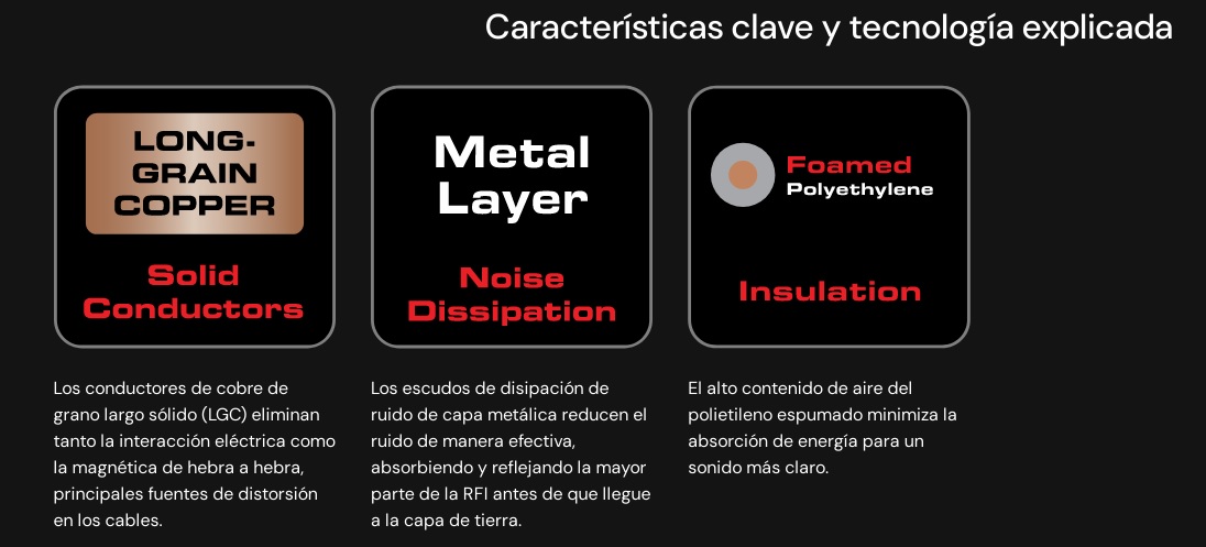 El Cobre de Grano Largo Sólido (LGC) permite un sonido más suave y claro que los cables que utilizan cobre OFHC (Alta Conductividad Libre de Oxígeno) regular. Los conductores sólidos evitan la interacción de las hebras, una fuente principal de distorsión. La calidad de la superficie es crítica porque un conductor puede considerarse como una guía de riel tanto para los campos eléctricos dentro de un conductor, como para los campos magnéticos fuera del conductor. LGC tiene menos óxidos dentro del material conductor, menos impurezas, menos límites de grano y definitivamente un mejor rendimiento.