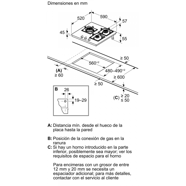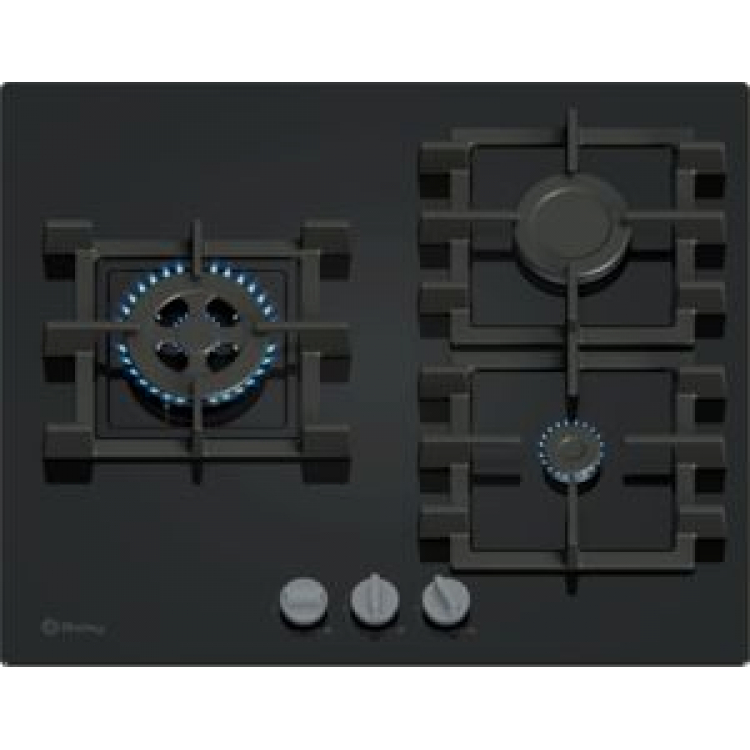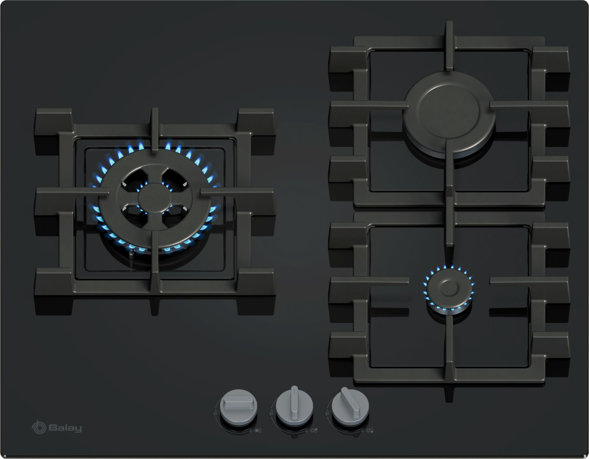Placa Gas 60cm BALAY 3ETG563QB con 3 quemadores BALAY, 3ETG563QB, Encimera, Gas, Encastrable, 60 cm., 3 quemadores, Cristal templado negro, Wok de 3,3 kW., Gas Stop, parrillas hierro fundido aptas lavavajillas, autoencendido.