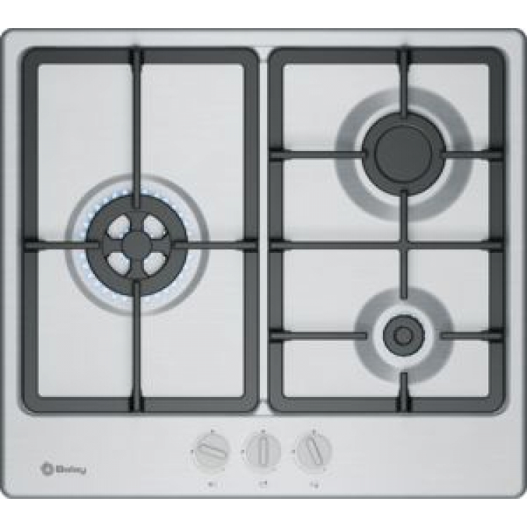 Placa Gas 60cm BALAY 3ETX563CB con 3 quemadores BALAY, 3ETX563CB, Encimera, Gas, Encastrable, 60 cm., 3 quemadores, Acero, Wok de 3,3 kW., Gas Stop, parrillas hierro fundido aptas lavavajillas, autoencendido.