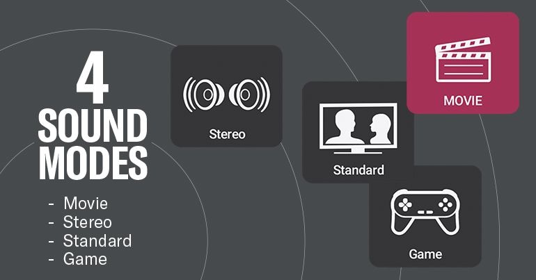 Con cuatro modos de sonido diferentes, puedes adaptar el sonido a tu contenido y estado de ánimo. El modo estéreo funciona muy bien para música y podcasts. El modo estándar es ideal para programas de televisión. Prueba el modo Juego para sumergirte en tu última batalla y usa el modo Película para crear una experiencia cinematográfica expansiva.