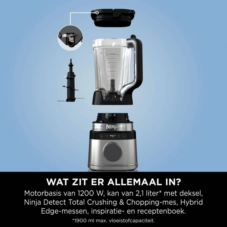Batidora de vaso NINJA TB201EU 1200W BATIDORA DE VASO NINJA DETECT POWER PRO 1200W. Velocidad: 12.000 rpm. Tecnología BlendSense. 10 velocidades manuales permiten mezclar, hacer puré y emulsionar ingredientes. Opciones de batido: Modos predefinidos, para picar carne, frutos secos, judías, legumbres y verduras en la jarra de gran capacidad de la batidora:Incluye guía de recetas.