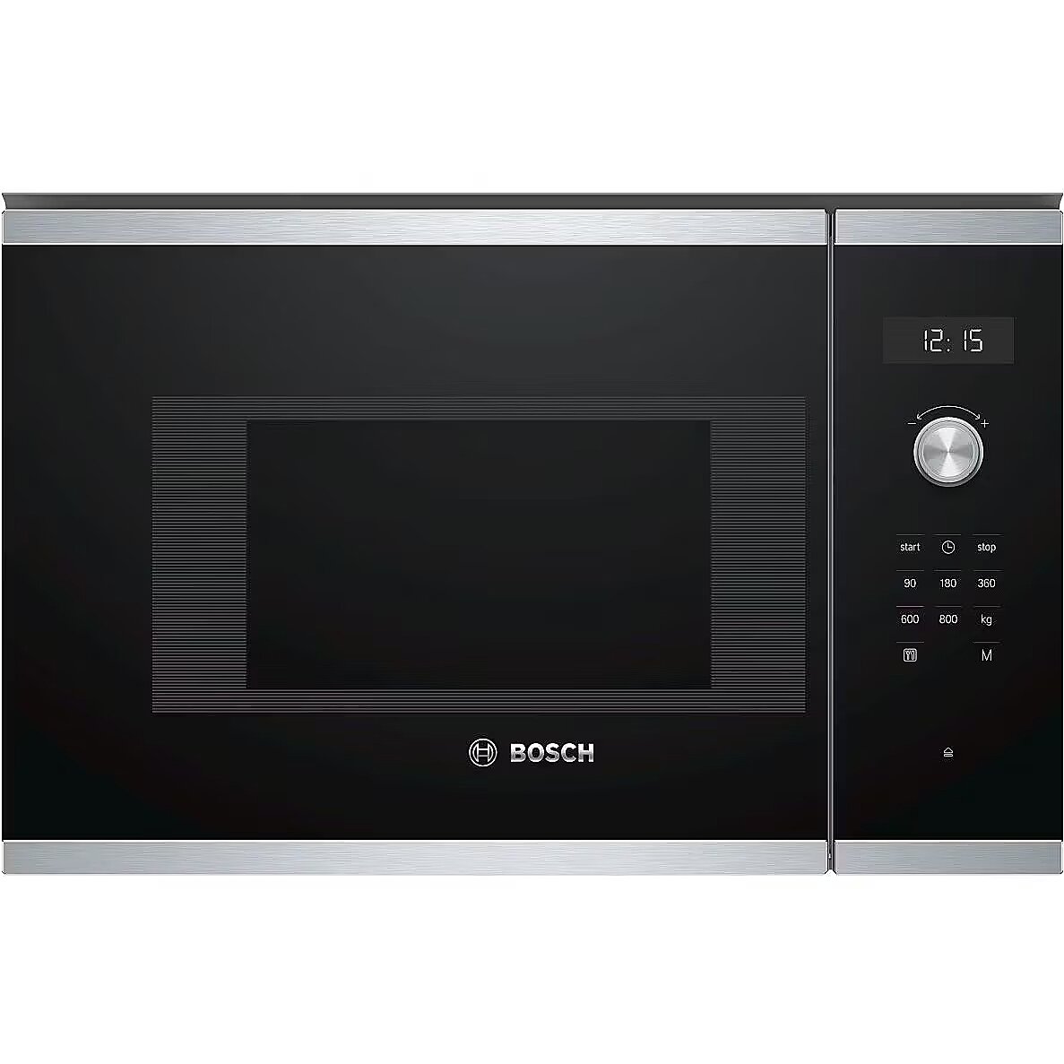 Microondas integrables sin marco y con plato giratorio Serie 6 BOSCH, BFL524MS0, Microondas, electrónico, Integrable sin marco, 38 cm., 20 l., 5 F., Asistente de limpieza con agua, Ap. lateral izquierda, Cristal negro/inox, Display LED, 7 prog. auto., Programación electrónica de paro, plato giratorio 25,5 cm., Mando ocultable, sin grill.