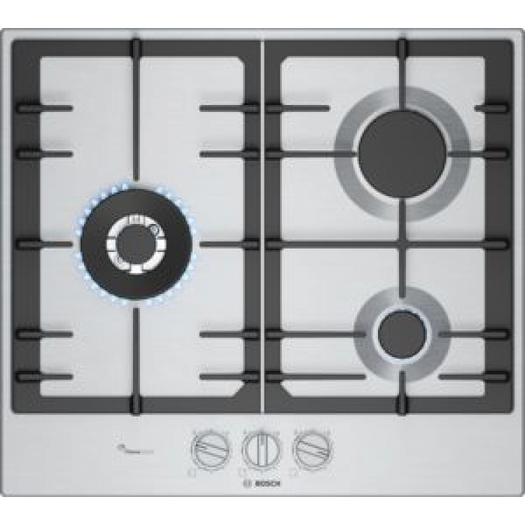 Placa Gas 60cm BOSCH PCC6A5I90 Serie 6 con 3 quemadores. Placas de gas BOSCH, PCC6A5I90, Encimera, Gas, Encastrable, 60 cm., 3 quemadores, Acero, FlameSelect, wok 4 kW., gasStop, parrillas hierro fundido aptas lavavajillas, autoencendido.