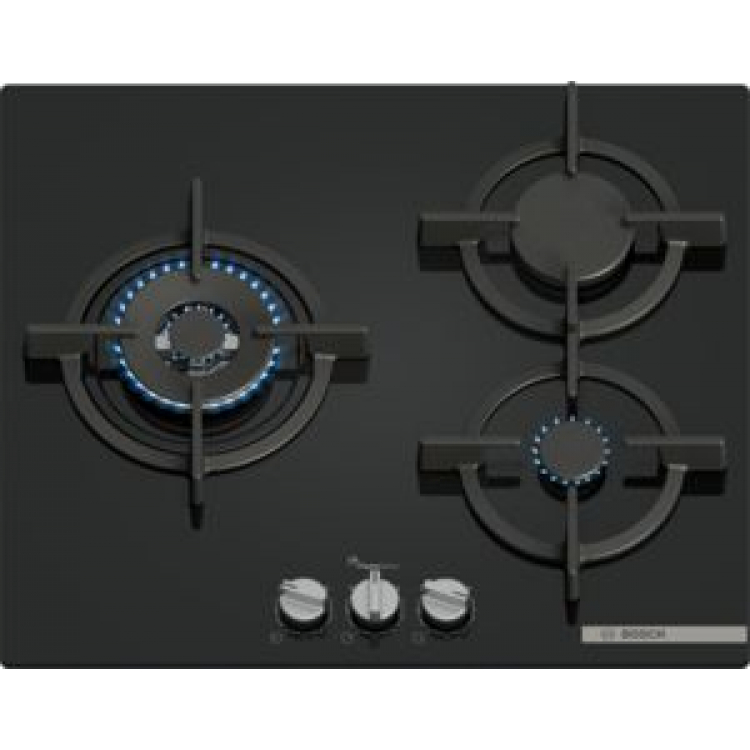 Placa Gas 60cm BOSCH PPC6A6I10 Serie 6 con 3 quemadores. Placas de gas BOSCH, PPC6A6I10, Encimera, Gas, Encastrable, 60 cm., 3 quemadores, Cristal templado negro, FlameSelect, wok 4 kW., gasStop, parrillas hierro fundido aptas lavavajillas, autoencendido.