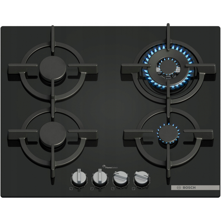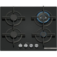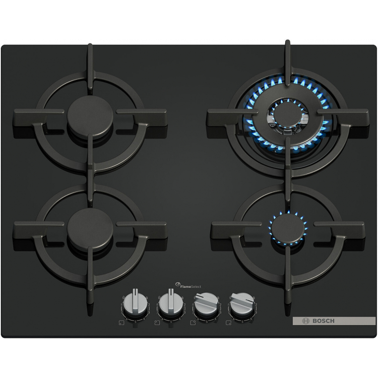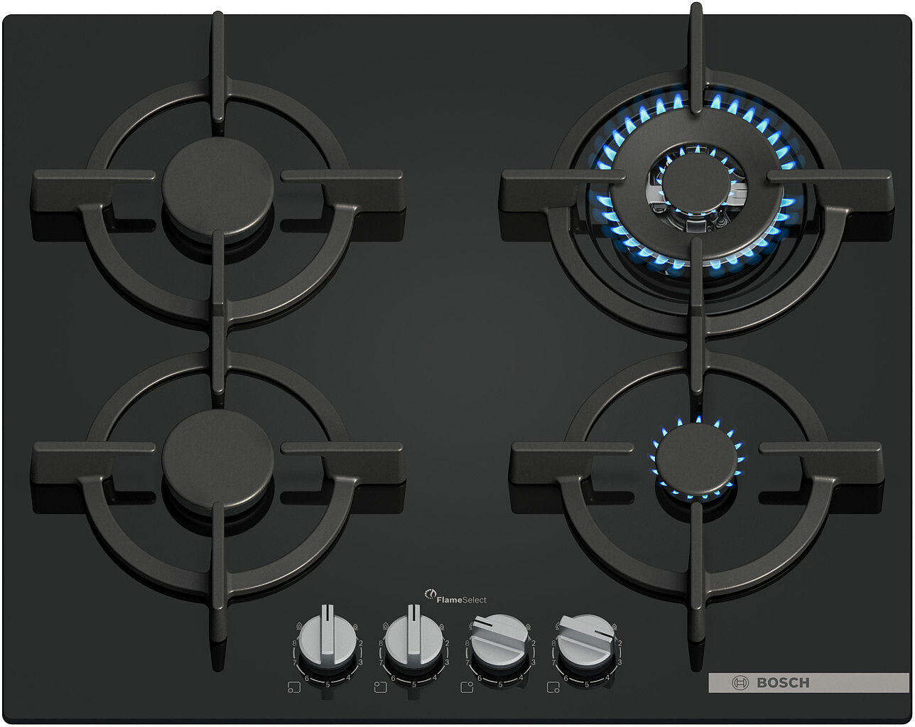 Placa Gas 60cm BOSCH PPH6A6I10 Serie 6 con 4 quemadores. Placas de gas BOSCH, PPH6A6I10, Encimera, Gas, Encastrable, 60 cm., 4 quemadores, Cristal templado negro, FlameSelect, wok 3,5 kW., gasStop, parrillas hierro fundido aptas lavavajillas, autoencendido.