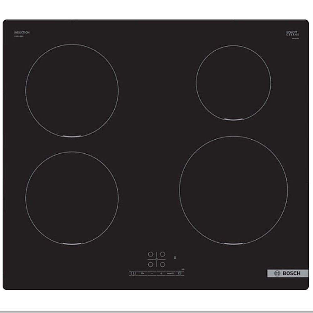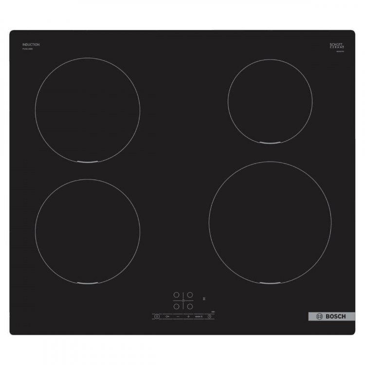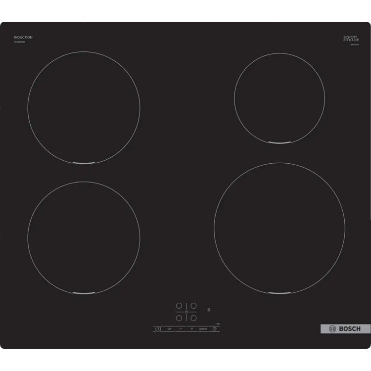 Placa Inducción 59,2cm BOSCH PUE611BB5E TouchSelect con 4 zonas de cocción - Placas de inducción - PUE611BB5E - Serie 4 - BOSCH, PUE611BB5E, Encimera, Inducción, Encastrable, 60 cm., 4 zonas, Color negro / terminación cristal, TouchSelect, serigrafía circular