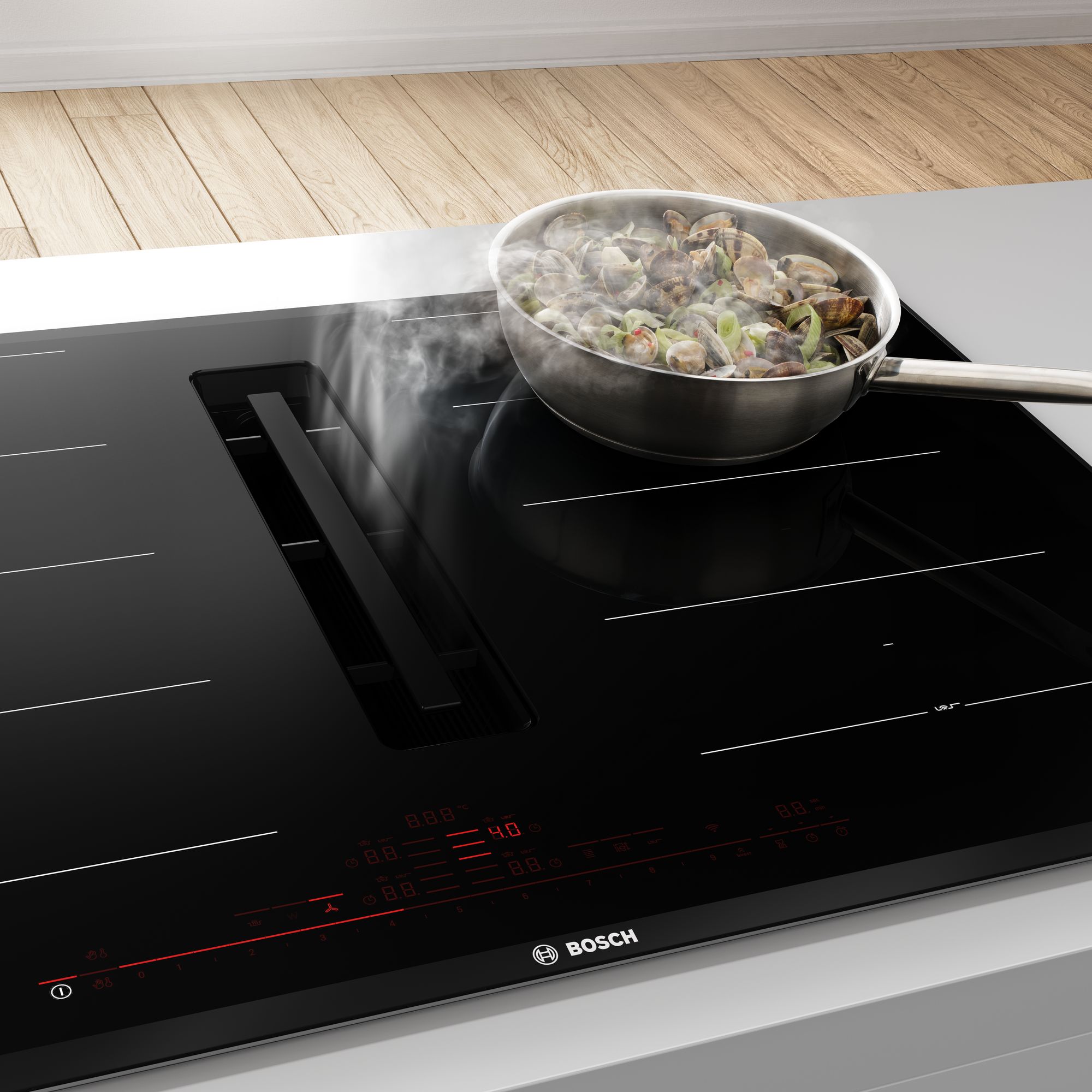 La placa con extractor integrado combina lo mejor de nuestras placas de inducción y campanas extractoras. Al estar integrado en la superficie de la placa, el extractor elimina el humo y los olores justo donde se originan. De este modo, no necesitas una campana y puedes usar ese espacio para poner más armarios o tener una cocina más despejada.
