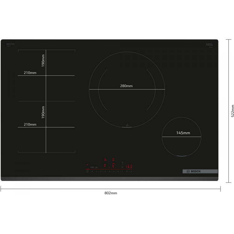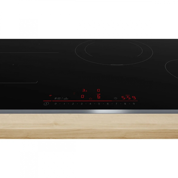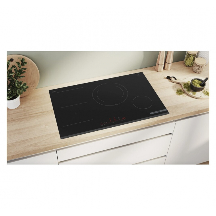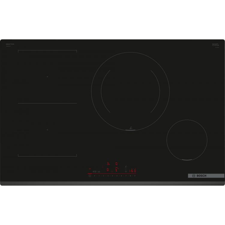 Placa Gas 80cm BOSCH PVS831HC1E Serie 6 con 4 zonas de cocción. Placas de inducción BOSCH, PVS831HC1E, Encimera, Inducción, Encastrable, 80 cm., 4 zonas, HC, Negro / bisel delantero, DirectSelect, control de tª en 11 niveles, zona de 28 cm.