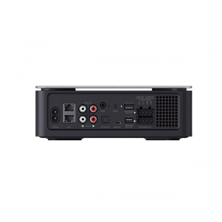 Bose Music Amplifier. Potencia: 125W x 2. Conectividad: Wi-Fi, Ethernet, & Bluetooth®. Tecnología SympleSync que permite enviar Bluetooth a otro dispositivo (altavoz, auricular etc..) . Compatible Apple AirPlay 2, Chromecast, Spotify Connect. Control por voz (no incluye micro). Dispone de entrada y salida de línea (configurable fija/variable) y doble puerto de ethernet. Configurable Mono/(Estéreo ). Ecualización. Bornas de conexión para 2 parejas de altavoces. Disponible ecualización específica para altavoces Bose 251/791. Salida de 3,5mm para módulo de graves. Compatible con la aplicación Bose Music app. Diseño sofisticado. Puede trabajar también como etapa de potencia fuera de red (formato esclavo) y conectarse a cualquier dispositivo. Incluye accesorio para montaje en pared y para montaje en rack 19” (dos unidades ocupan 19”