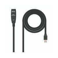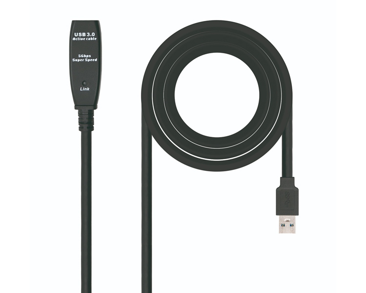Especificaciones:. Cable prolongador USB 3.0 con conector tipo A macho en un extremo y tipo A hembra en el otro.. Lleva amplificador para amplificar la señal de USB.. Máxima velocidad de transferencia: 5Gbps.. Es una solución ideal para necesidades de cable USB con longitud de más de 5 metros hasta un máximo de 20 metros (uniendo 4 cables prolongadores con alimentador).. No requiere software ni controladores, una solución totalmente plug and play.. Compatible con USB 2.0.. Longitud: 5 m.. Color: negro.. Normativas: RoHS.. Test de Funcionamiento: 100% testado.. Contenido del embalaje:. 1 x Cable USB 3.0 prolongador con amplificador, tipo A/M-A/H, 5 m