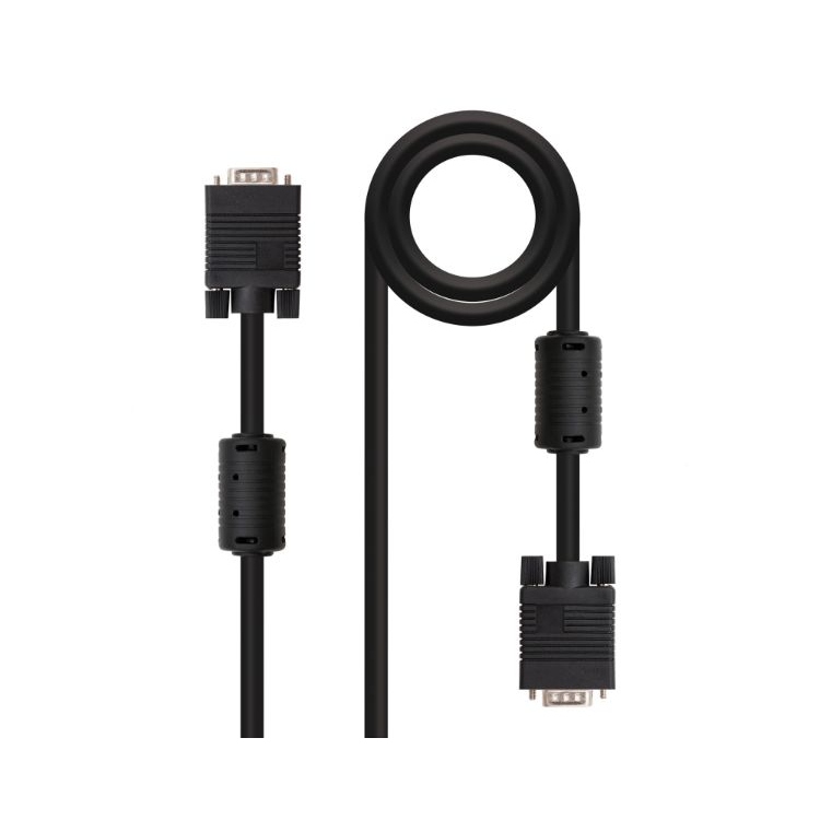 Cable SVGA de alta calidad para monitor, proyector y PC. . Especificación:. Conector tipo D-sub HDB15 macho en ambos extremos. 3 hilos coaxiales (doble apantallado) para señales de color de alta frecuencia más 4 hilos adicionales para la sincronización. Doble apantallado para todos los hilos para evitar pérdida de datos e interferencias electromagnéticas (EMI). Incluye además ferrita en ambos extremos para evitar interferencias de alta frecuencia.. Resolución máxima 2048 X 1536. Es un cable perfecto que proporciona una imagen perfecta. Longitud: 1.0 metros. Color: negro. NormativaS: RoHS. Test de Funcionamiento: 100% testado. . Contenido del paquete:. 1 x Cable svga con ferrita, hdb15/m-hdb15/m, 1.0 m