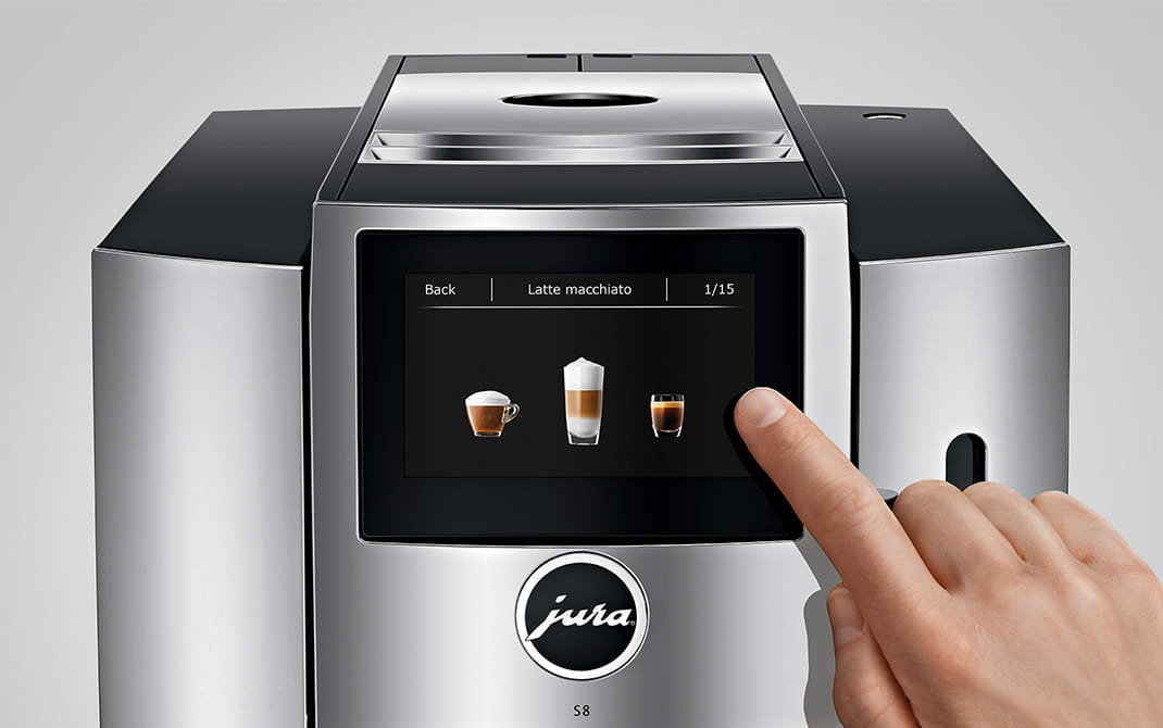 El control se vuelve cómodo y claro gracias al visualizador a color con pantalla táctil de alta resolución de 4,3'' integrado en la cafetera. Un toque suave y delicado de los dedos en la pantalla permite que su especialidad favorita fluya hasta la taza. La innovadora filosofía de control a través de la imponente pantalla destaca por su claridad, respondiendo así a las necesidades de estos tiempos modernos. La navegación es completamente intuitiva gracias a las instrucciones en forma de gráficos y animaciones que muestran al mismo tiempo todos los pasos de la preparación. Le lleva directamente hasta su objetivo. Las preferencias individuales se pueden programar con menos pasos. Cambiar de nombre, mover, copiar, duplicar: con la S8 se consigue en un abrir y cerrar de ojos. El control se puede manejar cómodamente si se desea a través de la aplicación gratuita JURA Coffee App siempre actualizada.
