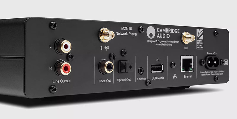 Gira el Cambridge Audio MXN10 y encontrarás la salida analógica RCA, sal salida digital coaxial y la salida digital óptica, el puerto de entrada USB, un par de enchufes de antena Wi-Fi para conexión de red inalámbrica, o una entrada de cable LAN si lo prefieres.