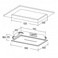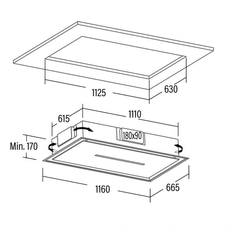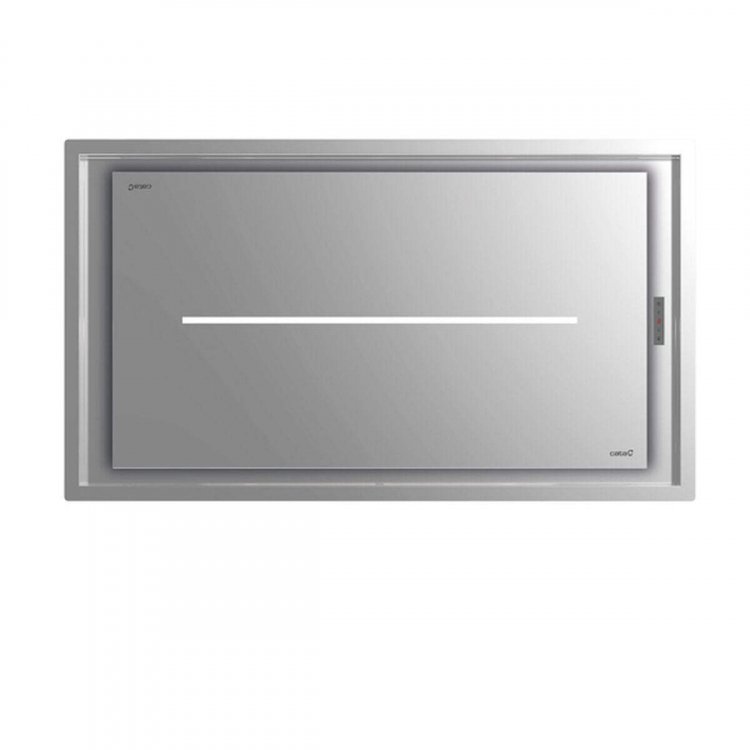 CAMPANAS - CAMPANA TECHO Campana integrable de techo SLIM (altura mínima de instalación 17cm) de de 1160x665mm (encastre 1125x630mm) con acabado en inox, de instalación simple con el motor integrado y descarga por las cuatro caras. Panel de Control Táctil, temporizador de desconexión automática, indicador de limpieza de filtros estándar y de carbón activo + Control Remoto. 6 niveles de extracción, 5 + 1 TURBO. Capacidad de extracción máxima ? mínima (Reg.(UE) nº65/2014): 620m3/h - 273m3/h. Nivel sonoro (Reg.(UE) nº65/2014): 50dB(A), máximo: 65dB(A). Motor extra silencioso. Consumo máximo de energía 105W. Iluminación de alta eficiencia mediante TIRA LED bicolor cálido/natural, regula- ble en intensidad. Clase de eficiencia energética: A++
