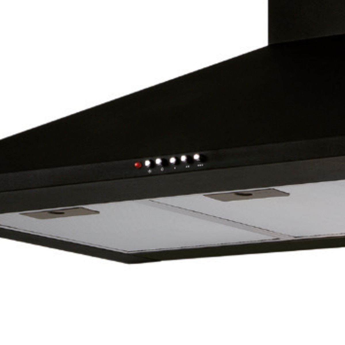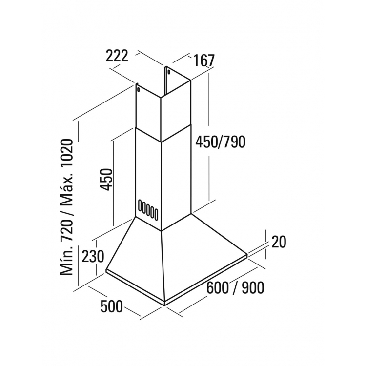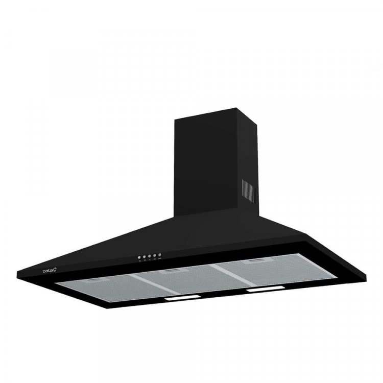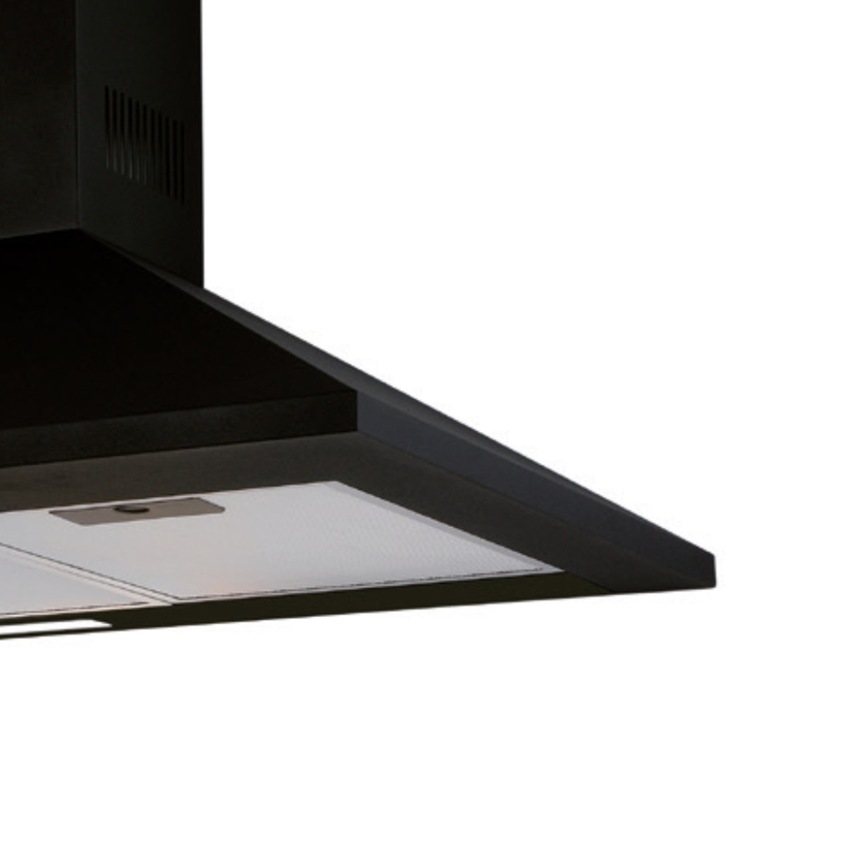 CAMPANAS - DECORATIVA TRAPEZOIDAL Campana decorativa de pared piramidal de 90cm con acabado en negro. Panel de Control Mecánico. 3 niveles de extracción. Capacidad de extracción máxima ?mínima (Reg.(UE) nº65/2014): 645m3/h - 385m3/h. Nivel sonoro (Reg.(UE) nº65/2014): 58dB(A), máximo: 72dB(A). Motor M3R. Extra silencioso. Consumo máximo de energía 270W. Iluminación de alta eficiencia mediante TIRA LED compacta. Clase de eficiencia energética: C