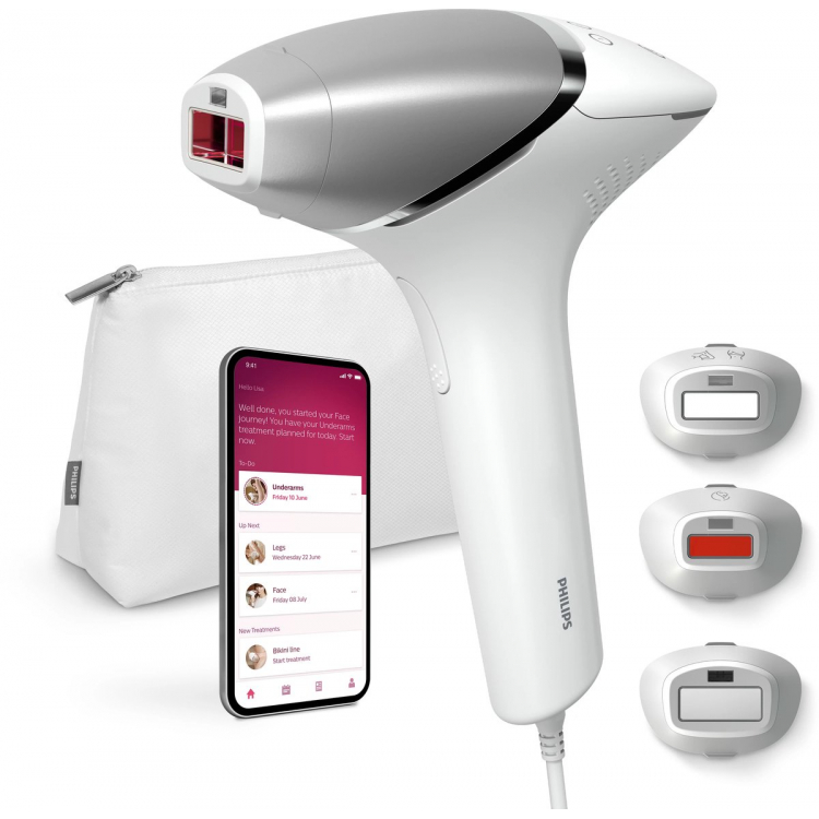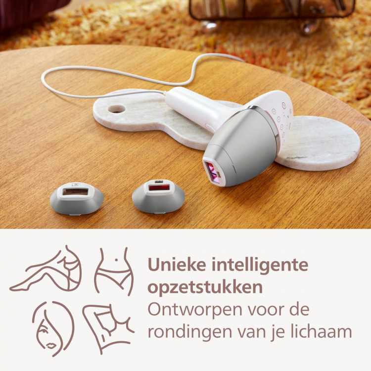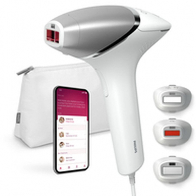 Depiladora por pulsos de luz PHILIPS BRI946/00 Sensor SmartSkin, 3 accesorios inteligentes: cabezal cuerpo con curva convexa con tamaño 4,1 cm2, cabezal cara( labio superior, mandíbula y barbilla) con forma plana y tamaño de 2 cm2 y filtro adicional y cabezal de precisión con forma cóncava y precisa con tamaño de 3 cm2. Con tecnología SenseIQLumea serie 8000 dispone de cinco ajustes de luz fácilmente ajustables. Nuestro sensor SmartSkin lee el tono de tu piel y te ayuda a encontrar el ajuste más cómodo. Los accesorios inteligentes adaptan el tratamiento a cada zona del cuerpo, Nuestra aplicación de asesoramiento gratuita te ayuda a planificar y cumplir tu programa de tratamiento, y te guía paso a paso en cada sesión. Uso con cable