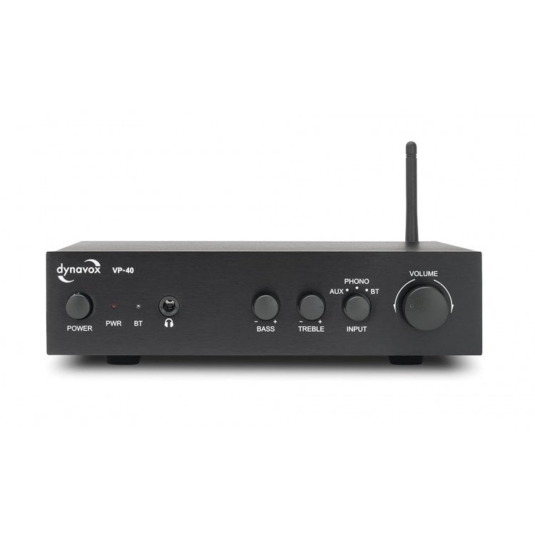 Dynavox VP40. El Dynavox VP-40 es un amplificador estéreo compacto de alta calidad para conectar dos fuentes de entrada analógica (una de ellas para Phono) además de Bluetooth.