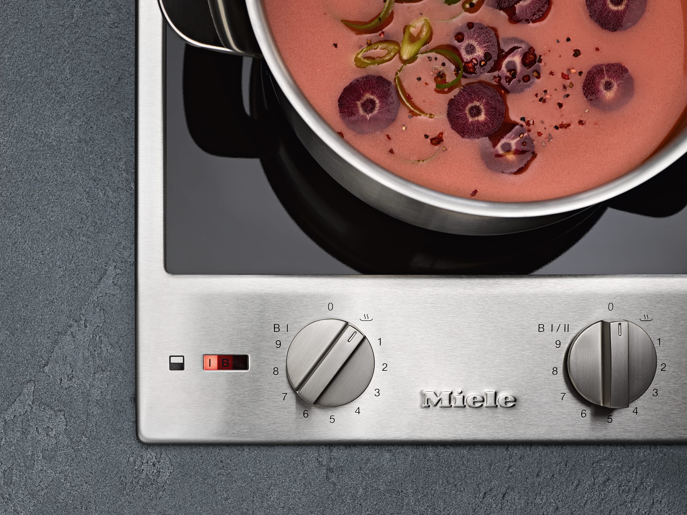 Las zonas para asar de los aparatos ProLine de Miele permiten el uso tanto de recipientes de cocción redondos como rectangulares. Las placas eléctricas y las placas de inducción están equipadas con zonas de asar.