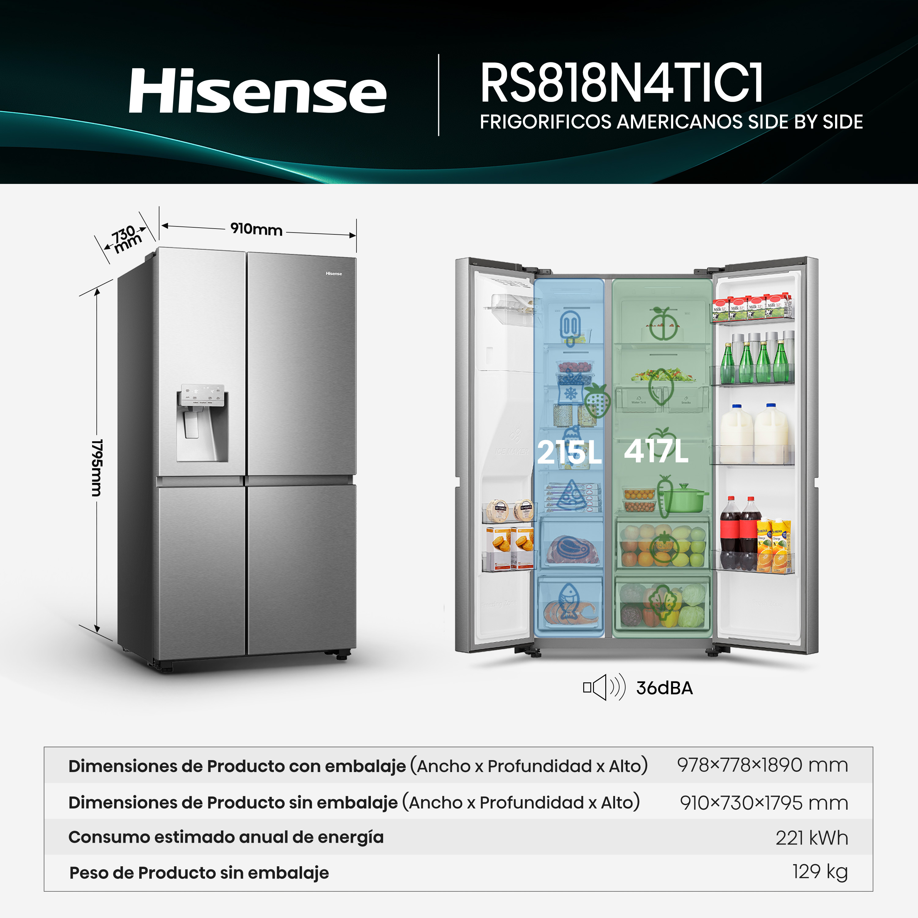 Frigo Americano HISENSE RS818N4TIC1 180x91x72 NF DISP INOX