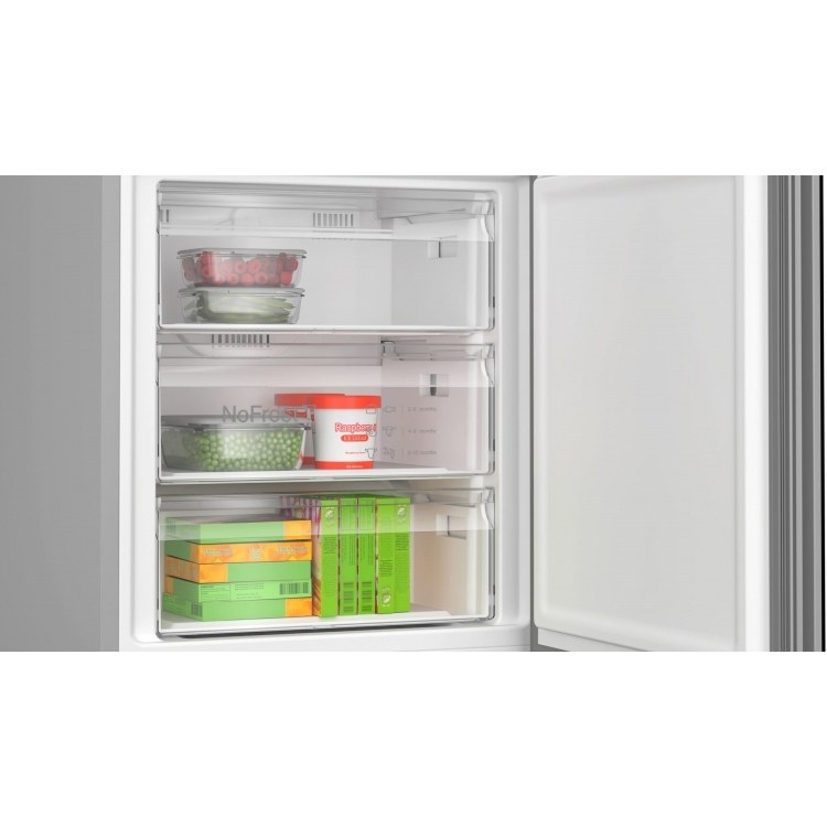 Serie 6, Frigorífico combinado de libre instalación, Acabado en cristal, 203 x 70 cm, Negro. KGN49LBCF. Figorífico NoFrost con tecnologia de conservación VitaFresh y capacidad XXL: mantiene sus alimentos frescos durante más tiempo. NoFrost: no pierdas más tiempo descongelando el frigorífico. VitaFresh XXL 0 °C: conserva los alimentos frescos durante más tiempo en los cajones extragrandes con regulación de la temperatura y la humedad. Metal MultiAir Flow para la óptima distribición de temperatura en el interior. 2 circuitos de frío independientes: control independiente del frigorífico y del congelador - evita la transferencia de olores. Flex Interior: ajusta el interior del frigorífico a tus necesidades gracias a las bandejas flexibles de la puerta.