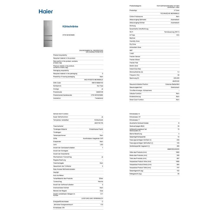 Frigorifico Combi HAIER HTW5618CNMG