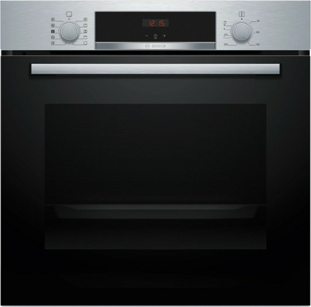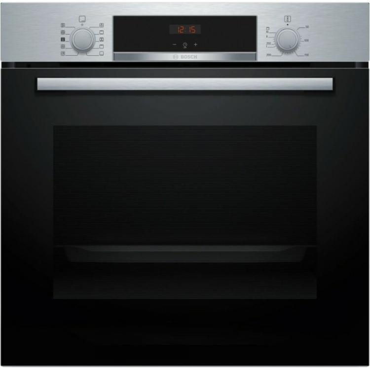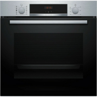 Hornos Multifunción Serie 4 BOSCH, HQA514ES3, Horno, Multifunción con vapor añadido, A+, Integrable, 60 cm., 71 l., 8 F., Asistente de limpieza con agua, Ap. Abatible, Cristal negro/inox, Display LED, Reloj electrónico con programación de inicio y paro, Railes 1 nivel, Mandos ocultables.