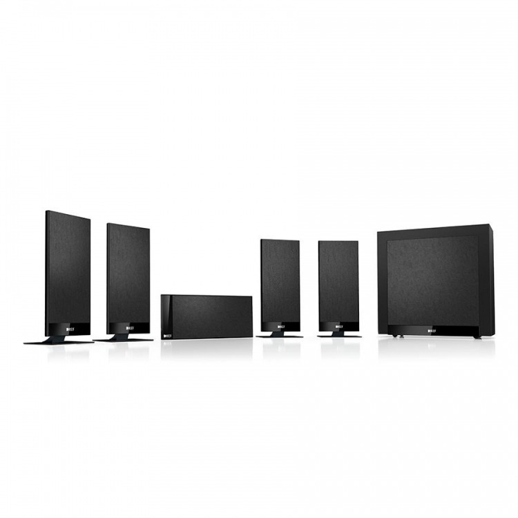 KEF T105 system BLACK. Sistema 5.1 compuesto por satélites + subwoofer. 4 x Satélites T101. Satélite central T101c. Subwoofer T2.