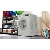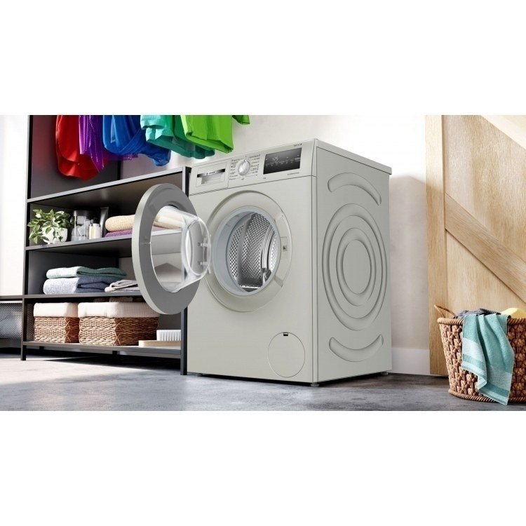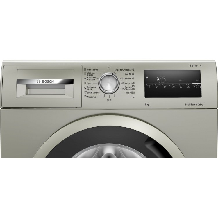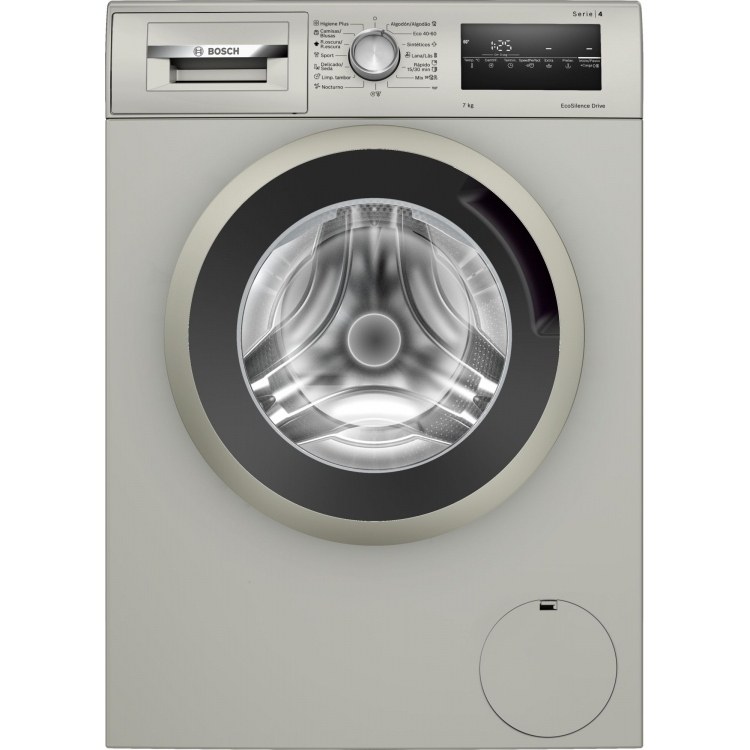 Bosch Serie 4, Lavadora de carga frontal, 7 kg, 1200 r.p.m., Acero mate antihuellas WAN2427YES Lavadora con motor EcoSilence: silenciosa y duradera. Tecnología ActiveWater: mínimo consumo de agua para cuidar el medio ambiente y tu bolsillo. SpeedPerfect: limpieza perfecta hasta en un 65 % menos de tiempo*. Función Pausa+Carga: ¿has olvidado algo? Añádelo fácilmente a la lavadora. Motor EcoSilence™: funcionamiento silencioso y de bajo consumo, con una garantía de 10 años. Hygiene Plus: lavado higiénico, matando los gérmenes de manera efectiva incluso a 40°. Lavadoras Ecosilence (10 Años Gª Motor) BOSCH, WAN2427YES, Lavadora, Carga Frontal, B, Libre instalación, 60 cm., 7 kg, 1.200 rpm, Acero mate, Motor EcoSilence, Display LED con recomendación de carga, ActiveWater plus, 3G, SpeedPerfect, P+C Serie 4