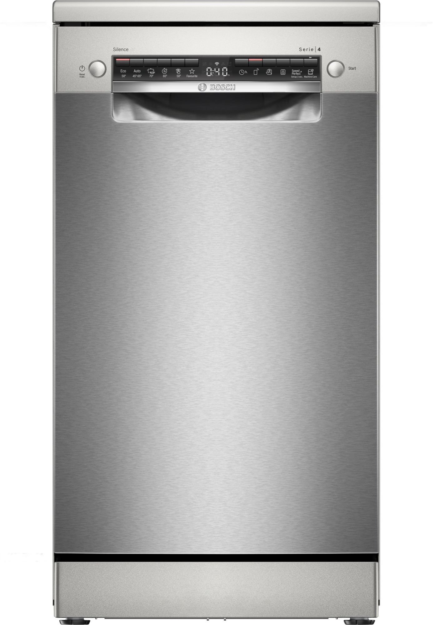 Lavavajillas libre instalación ancho 45 cm. Serie 4 - BOSCH, SPS4EMI61E, Lavavajillas, D, Libre instalación, 45 cm , 10 servicios, HC, Acero inoxidable, 6,7 litros. diseño display+teclas, 3ª bandeja, Prgr. Auto 1h Favorito. Pro, esp. limpieza cuba 2.0. 3f. Secado eficiente, VSPlus., 45dB. Apertura automática de puerta -