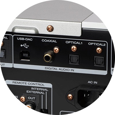 Las entradas digitales ópticas y coaxiales para los componentes fuente existentes admiten archivos de hasta 192 kHz / 24 bits. El SACD 30n también viene con una entrada asíncrona USB-B para conexión directa a un ordenador. La entrada USB-B es compatible con archivos de música PCM y DXD de hasta 384 kHz / 32 bits, así como con DSD2.8MHz, DSD5.6MHz y DSD11.2MHz.