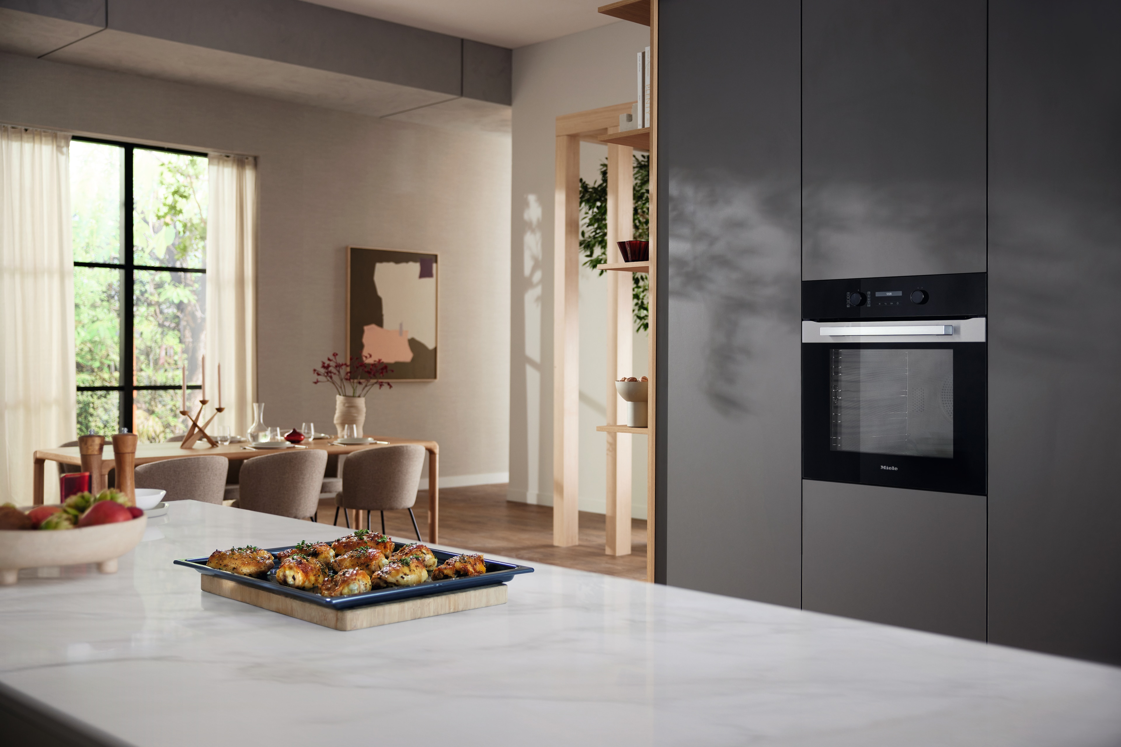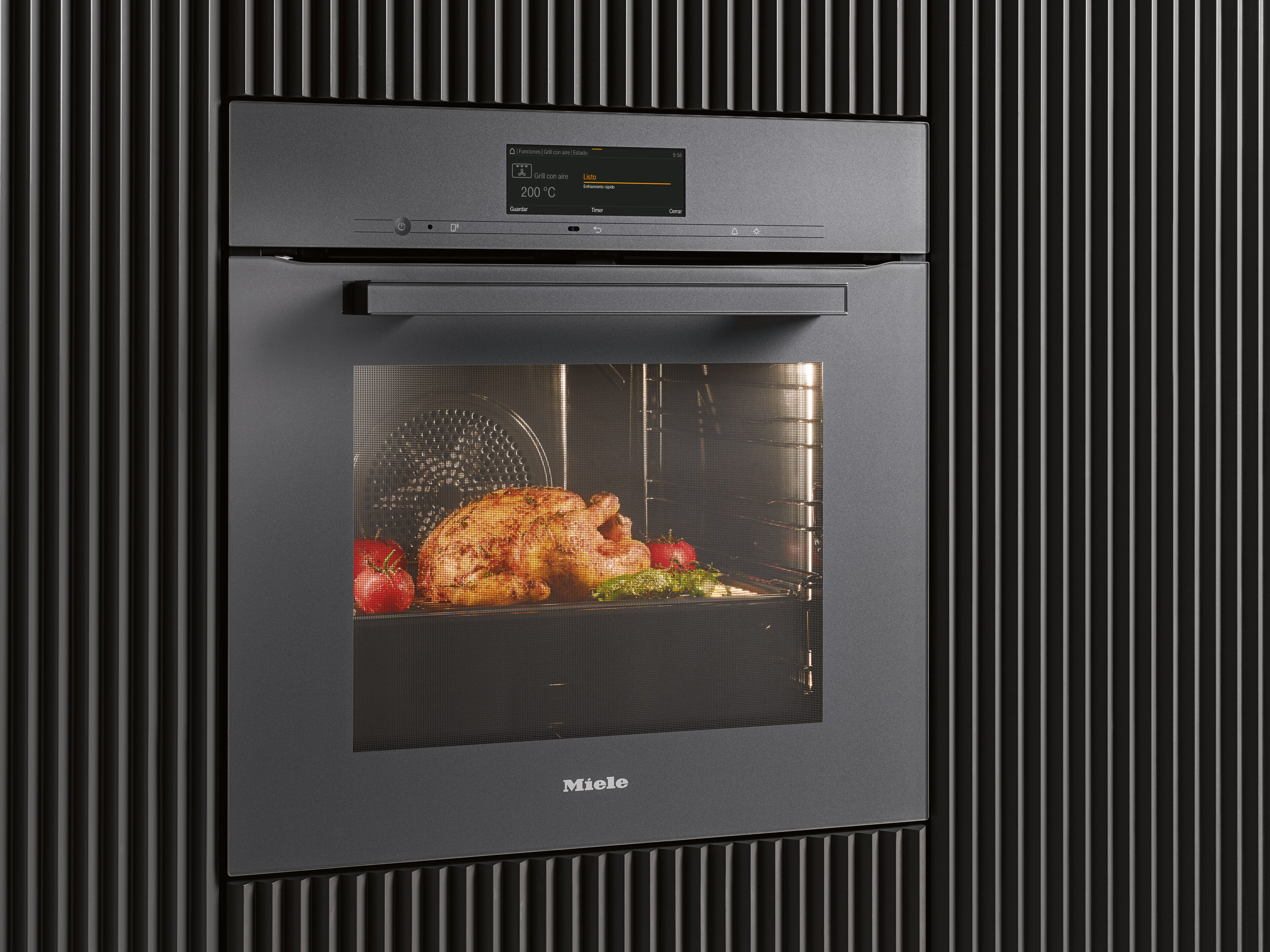 Los hornos de Miele se enfrían por completo. De esta forma la zona de manejo y de agarre, así como el entorno de los muebles se mantiene relativamente frío. La estructura múltiple del cristal aísla la puerta del horno de forma efectiva y se encarga de que la temperatura sea reducida en el lado exterior de la puerta y con ello seguridad y protección frente a quemaduras.
