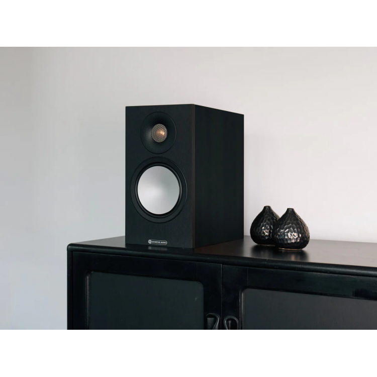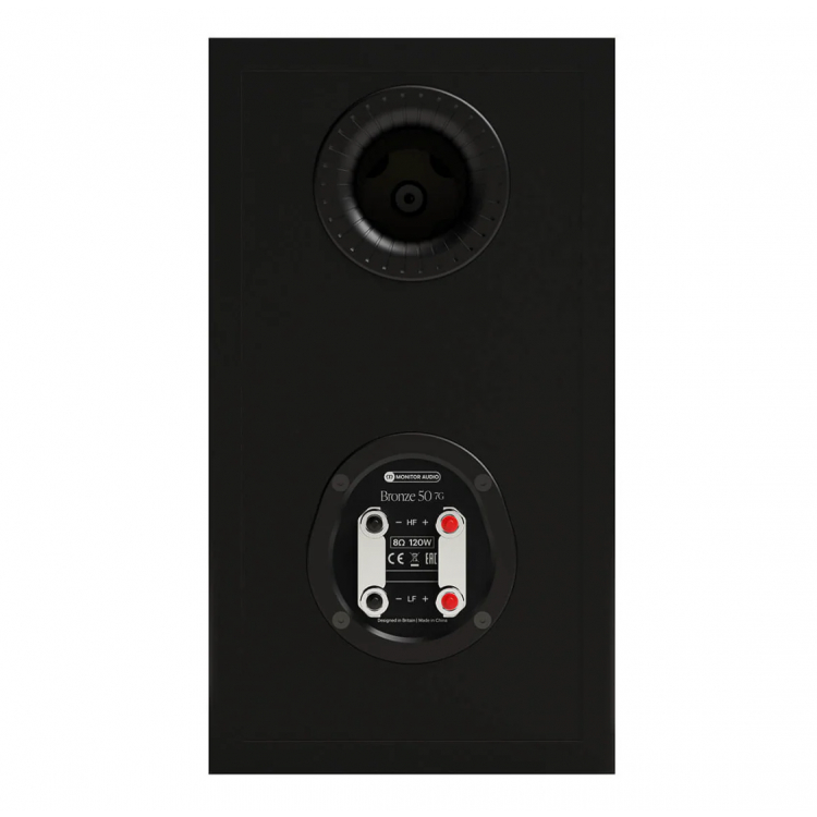 Monitor Audio Bronze 50 7G. Monitor compacto de 2 vías, 1 controlador de medios de graves C-CAM de 6”, 1 tweeter C-CAM Gold Dome de 25 mm. Respuesta de frecuencia (-6dB): 41 Hz — 30 kHz. Sensibilidad: 86 dB Impedancia nominal: 8 ohmios. Impedancia mínima (20 Hz a 20 kHz): 4.0 Ohmios @ 200 Hz SPL máximo: 112 dB. Manejo de potencia continua: 100 W. Potencia recomendada del amplificador (RMS, señal de música): 50 - 200 W en 4 ohmios/30 - 100 W en 8 ohmios. Alineación de graves: Puerto - HiVe II. Frecuencia de sintonización de puertos: 47 Hz. Frecuencia de cruce LF/HF: 3,0 kHz Dimensiones externas con todos los accesorios instalados (alto x ancho x profundidad): 335 x 185 x 328 mm. Peso (cada uno): 6,4 kg. Acabados: nogal, blanco y negro