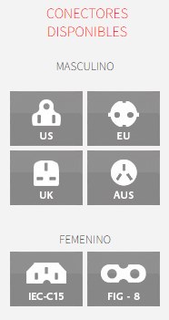 | TERMINACIONES DISPONIBLES | EE. UU. (NEMA), UE (Schuko), Reino Unido o Australia según IEC-C15. Figura 8 IEC-C7 también disponible. |