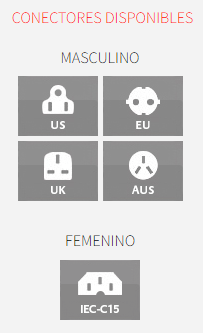| TERMINACIONES DISPONIBLES | EE. UU. (Nema), UE (Schuko), Reino Unido o AUS a conector IEC-C15 |