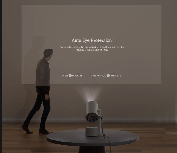 Seguridad. Gracias a sus sensores ToF inteligentes, el proyector MoGo 3 Pro sabe cuándo alguien ha pasado por delante y atenúa temporalmente la luz del proyector, garantizando que todo el mundo esté cómodo y seguro.