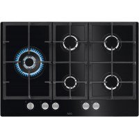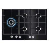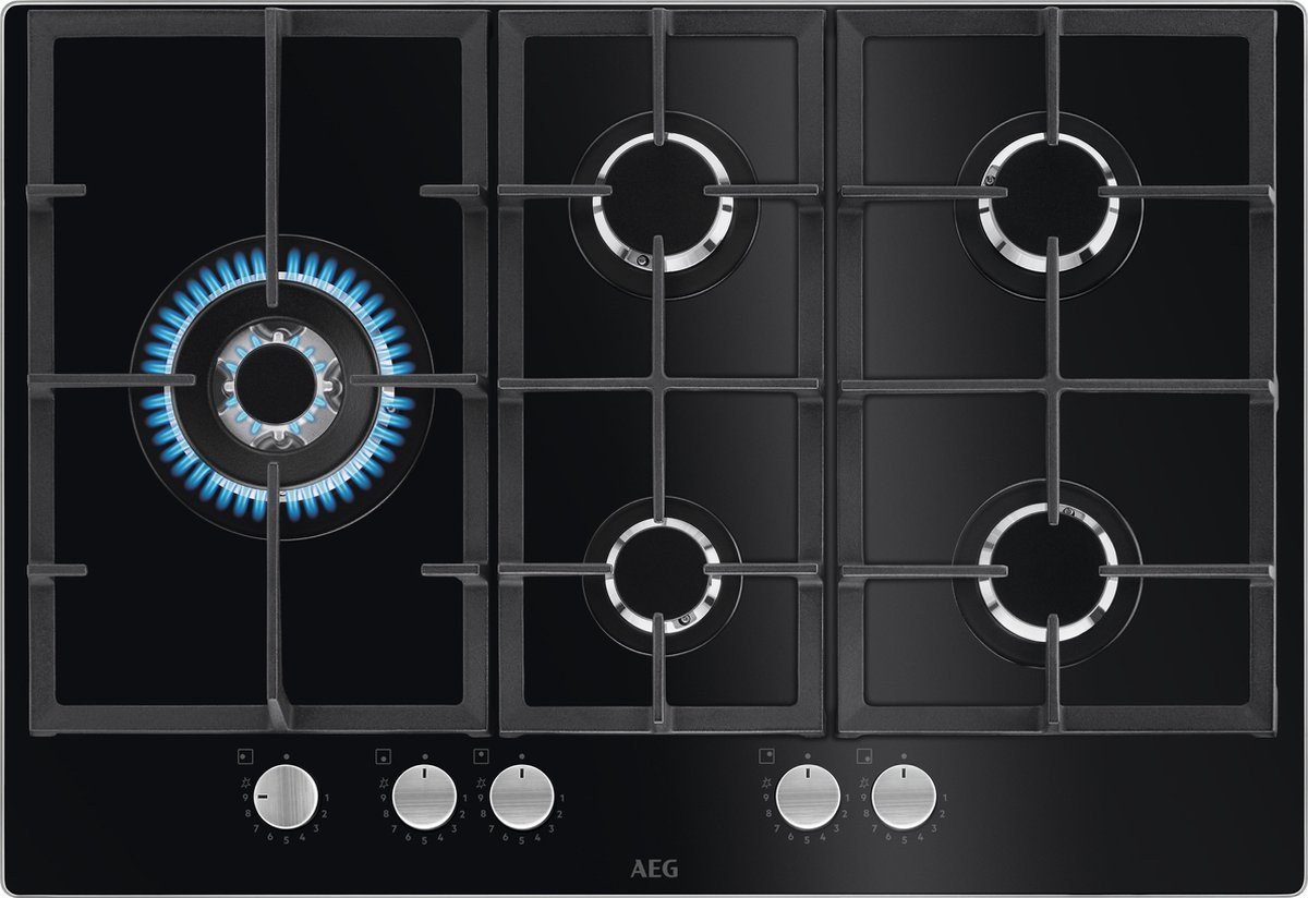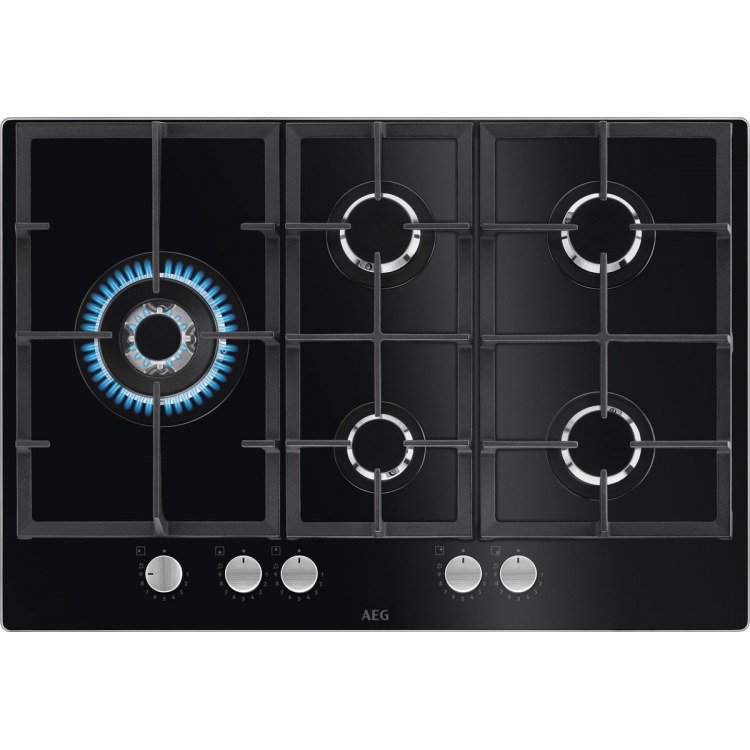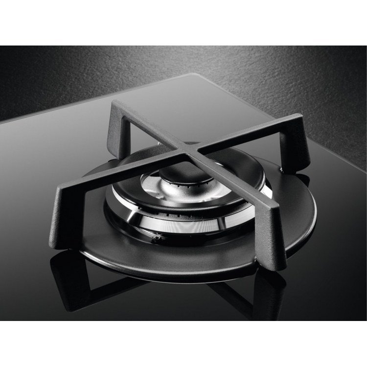 Placas Gas Gas On Glass Serie 6000 Speed Burner, 75 cm, Mandos StepPower (9 níveles), 5 quemadores: 4 SpeedBurner + 1 Wok, Sistema de seguridad, Parillas de hierro hundido, Autoencendido electrónico, Apta para gas natural/butano/propano, Cristal