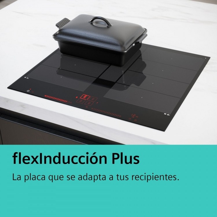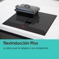 Cocina con recipientes extragrandes (hasta 30 cm de diámetro) gracias a flexInducción Plus, la zona de cocción flexible que se adapta automáticamente. Detecta el tamaño del recipiente y activa la superficie de inducción adicional que sea necesaria para obtener un calor uniforme. También es perfecta para usar planchas o Teppan Yaki de hasta 40 cm de largo.
