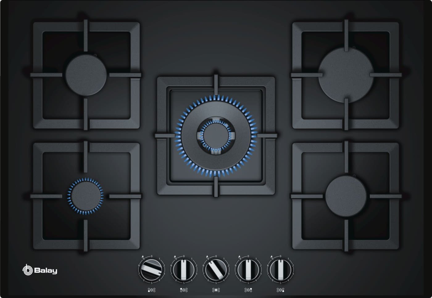 Placa Cristal Gas Ancho 75 Cm BALAY, 3ETG676HB, Encimera, Gas, Encastrable, 75 cm.., 5, Cristal templado negro, Control preciso de la llama con 9 niveles de potencia, wok 4 kW, Gas Stop, parrillas hierro fundido, autoencendido, biselada