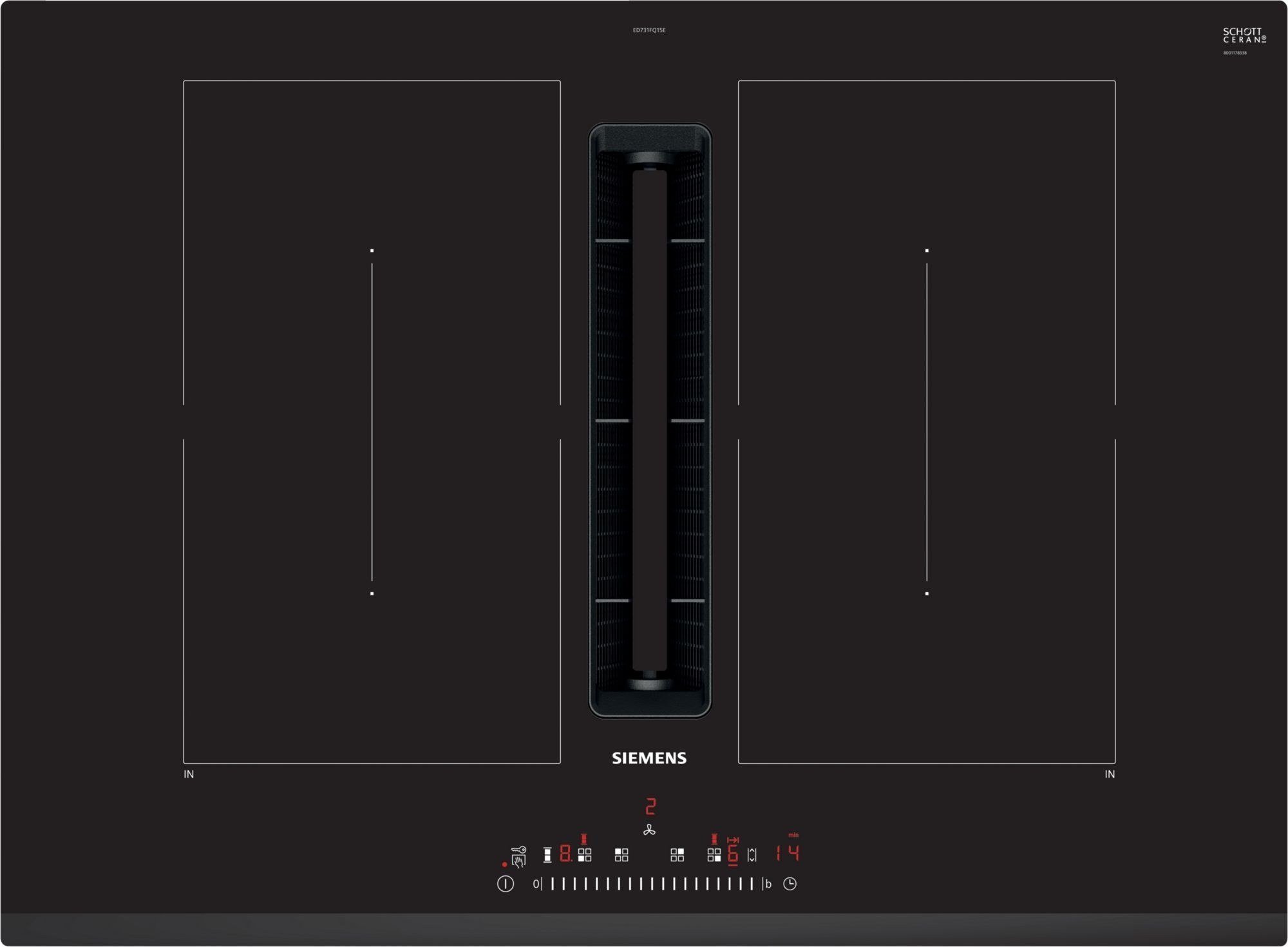 La fusión de dos electrodomésticos en uno implica medir cada detalle. Por eso la placa flexinducción con extractor integrado Siemens cuenta con 17 niveles de potencia, 622 m³/h de potencia máxima de extracción y 30 cm de pantalla para albergar un control lightSlider discreto, intuitivo y muy fácil de utilizar que desaparece cuando se apaga la placa.