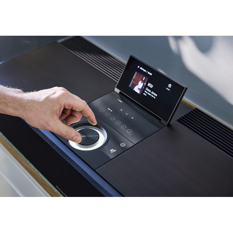 El sistema todo en uno ofrece control y conexión sin esfuerzo. Su pantalla táctil fija, pantalla motorizada y control de volumen de gran tamaño facilitan el acceso y la monitorización de todas las opciones de entretenimiento directamente desde el dispositivo. Como alternativa, el mando a distancia y la aplicación PRISMA permiten una configuración y un control completos a distancia.
