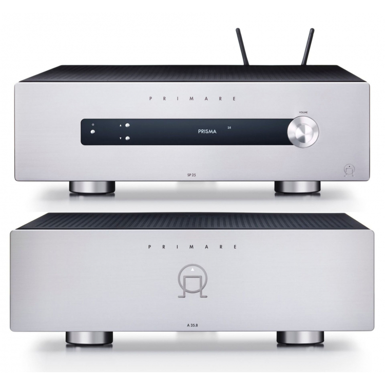 Primare SP25 + Primare A35.8. Forman un potente sistema de cine en casa o estéreo de alta gama. El SP25 se encarga del procesamiento de audio y vídeo y de la conectividad, mientras que el A35.8 proporciona la amplificación necesaria para los altavoces, resultando en una solución integral para experiencias de audio inmersivas de alta calidad.