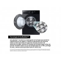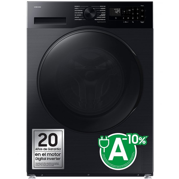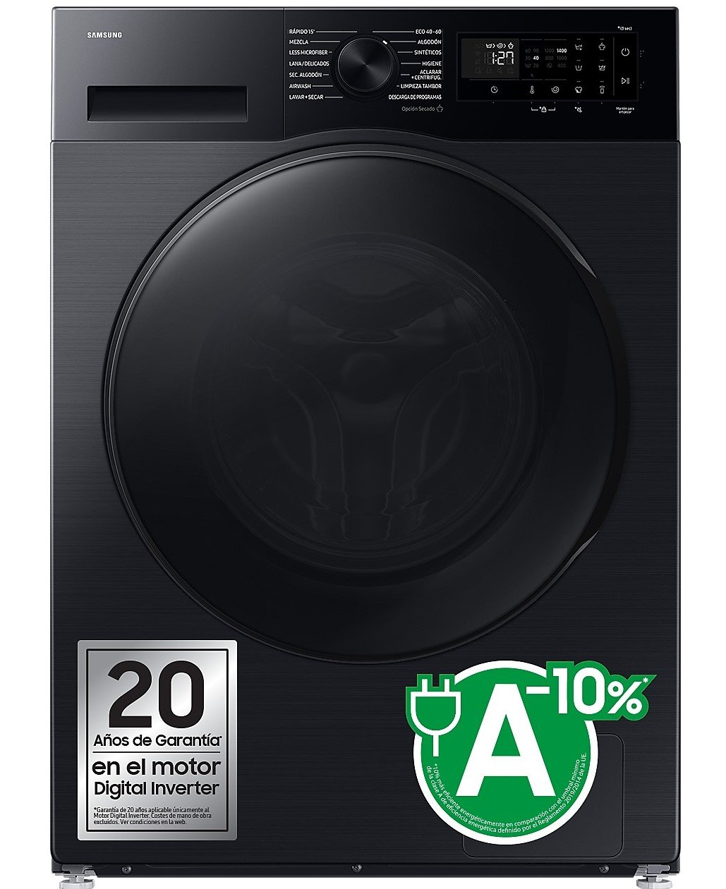 Lavasecadora SAMSUNG WD11DG5B15BBEC 11Kg lavado y 1400Rpm 6Kg secado Clase D Negro. WM - LAVA SECADORAS STANDARD WD11DG5B15BBEC - Serie 5. AI Ecobubble, WIFI con Smart things y con 14 ciclos. FONDO STANDARD 60CM Clase energética: A-10%/D Capacidad: 11/6 KG Wifi Decibelios: 72 Consumo: 48/308 Acabado: Negro