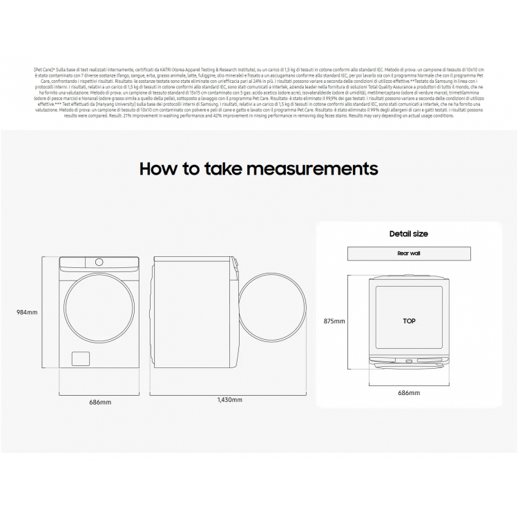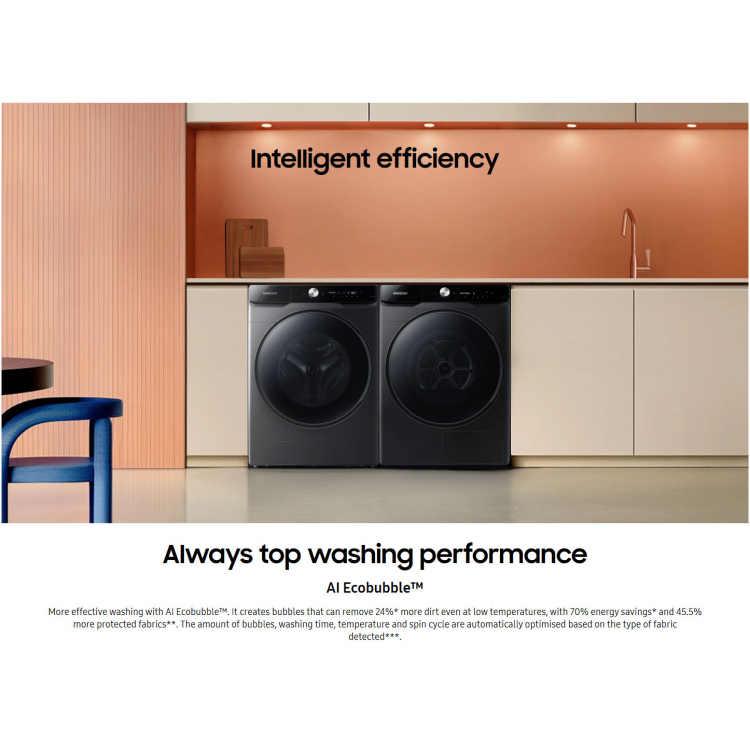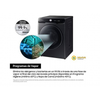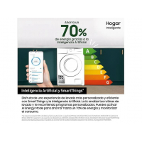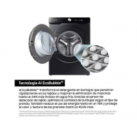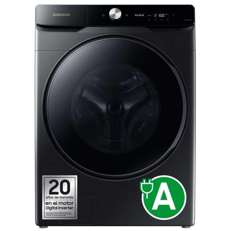 Lavadora 20Kg 1000Rpm SAMSUNG WF20DG8650BVU3 Clase A. Serie 50, Ecobubble, AI WASH, VRT+ (Control vibracion motor), Motor Digital Inverter, 1.000rpm, Modo Vapor, lavado especial para mascotas y de 30 min para 3KG.Puerta negra y Display AI Control. Fondo total (inc. ojo de buey) 875mm. La WF20DG8650BVU3 es una lavadora Samsung de 20 kg de capacidad y carga frontal , con una eficiencia energética de Clase A y color negro . Cuenta con tecnologías avanzadas como AI EcoBubble™ para disolver el detergente en agua fría y AI Wash que detecta el peso, tipo de tejido y nivel de suciedad para optimizar el ciclo de lavado. Su conectividad Wi-Fi a través de la aplicación SmartThings permite controlar la lavadora a distancia, mientras que su motor Digital Inverter y el sistema antivibración VRT+ garantizan un rendimiento eficiente y silencioso.