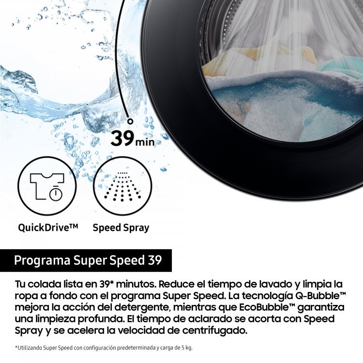 - QuickDrive™ y Super Speed : La tecnología QuickDrive™ puede reducir el tiempo de lavado hasta en un 50%. El programa Super Speed permite lavar una carga de 5 kg en tan solo 39 minutos.