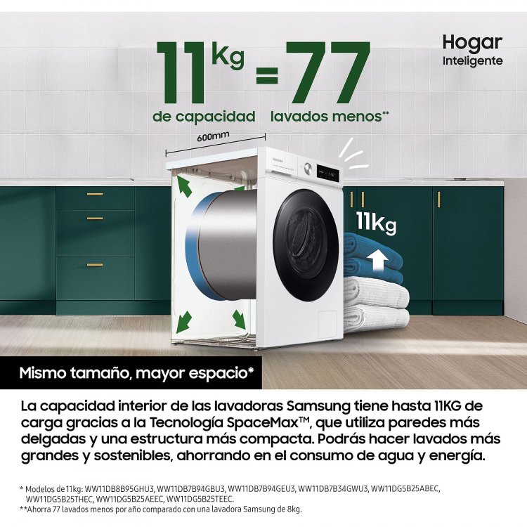 Lavadora SAMSUNG WW11DB7B34GWU3 11KG 1400RPM BCO. La Samsung WW11DB7B34GWU3 es una lavadora de carga frontal con 11 kg de capacidad y clasificación energética A-20% , que destaca por su tecnología AI EcoBubble™ para una limpieza eficiente, su conectividad Wi-Fi a través de SmartThings , y el programa SuperSpeed 39 min para cargas rápidas. Incorpora el motor Digital Inverter para un funcionamiento silencioso y duradero, y cuenta con funciones avanzadas como el lavado en frío para proteger las fibras y la opción de lavado a vapor higiénico .